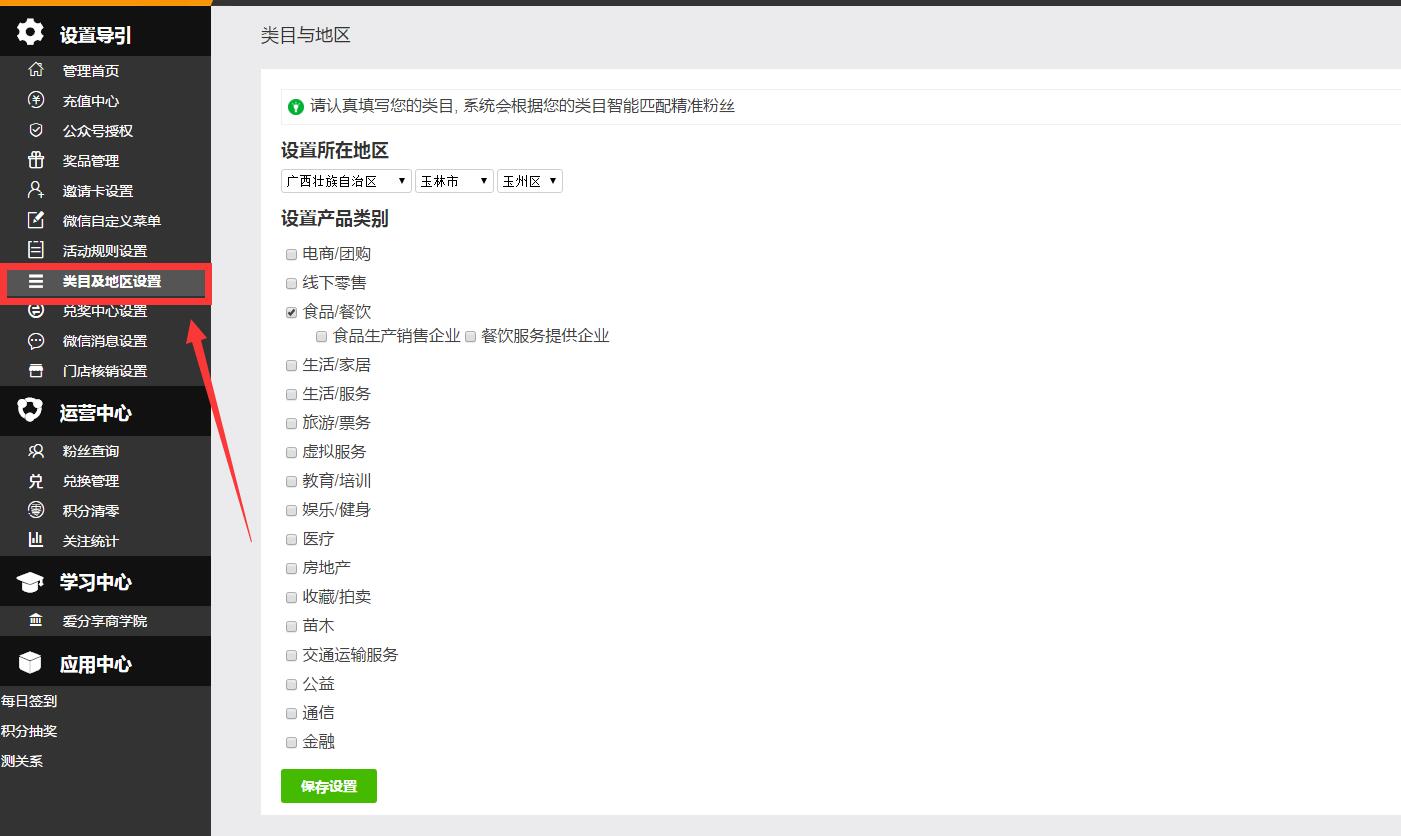 建议设置商家类目及地区,主要目的是方便该地区的粉丝快速筛选自己需要的产品类型和地区。例如一家位于玉林的主营线下消费的美食城,如果不设置所在地区,就有可能造成身处南宁的粉丝获得积分后才发现难以进行兑换的尴尬: