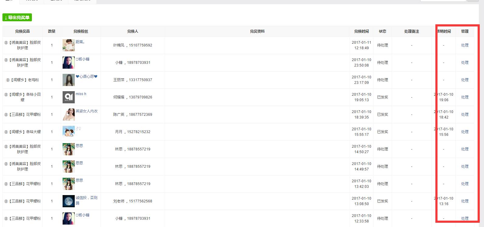 处理兑奖。在粉丝进行兑换后(特别是非线下兑奖),商家需要及时在爱分享后台处理兑奖记录。只需要在兑奖列表页右边点击“处理”,在弹出的管理框里选择处理状态和说明即可: