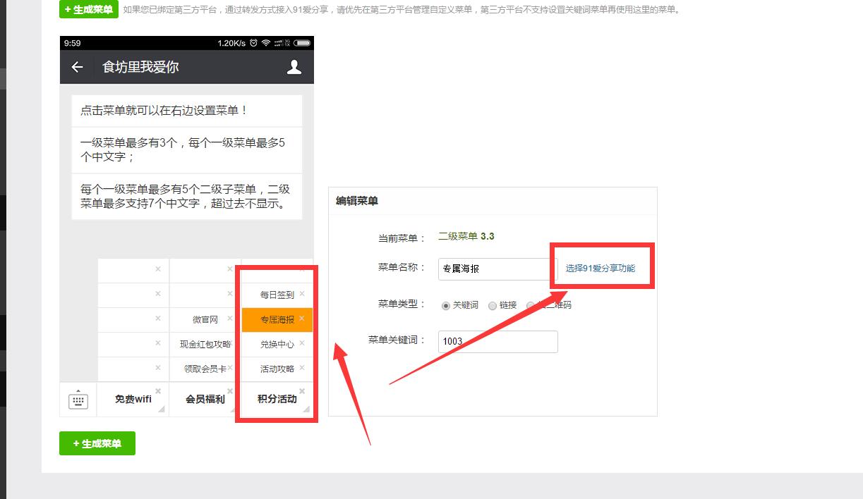 3. 要在微信平台开展91爱分享的邀请卡活动,一般来说需要预留至少1个一级菜单(活动主菜单)和3个二级菜单,分别是邀请卡的生成菜单、兑换中心的菜单和活动规则菜单。此外,使用爱分享平台里的其他积分功能,也需要预留相应的菜单(如每日签到、抽奖等)。设置方式为:点选相应菜单位置,在右边“编辑菜单”中点击“选择91爱分享功能”: